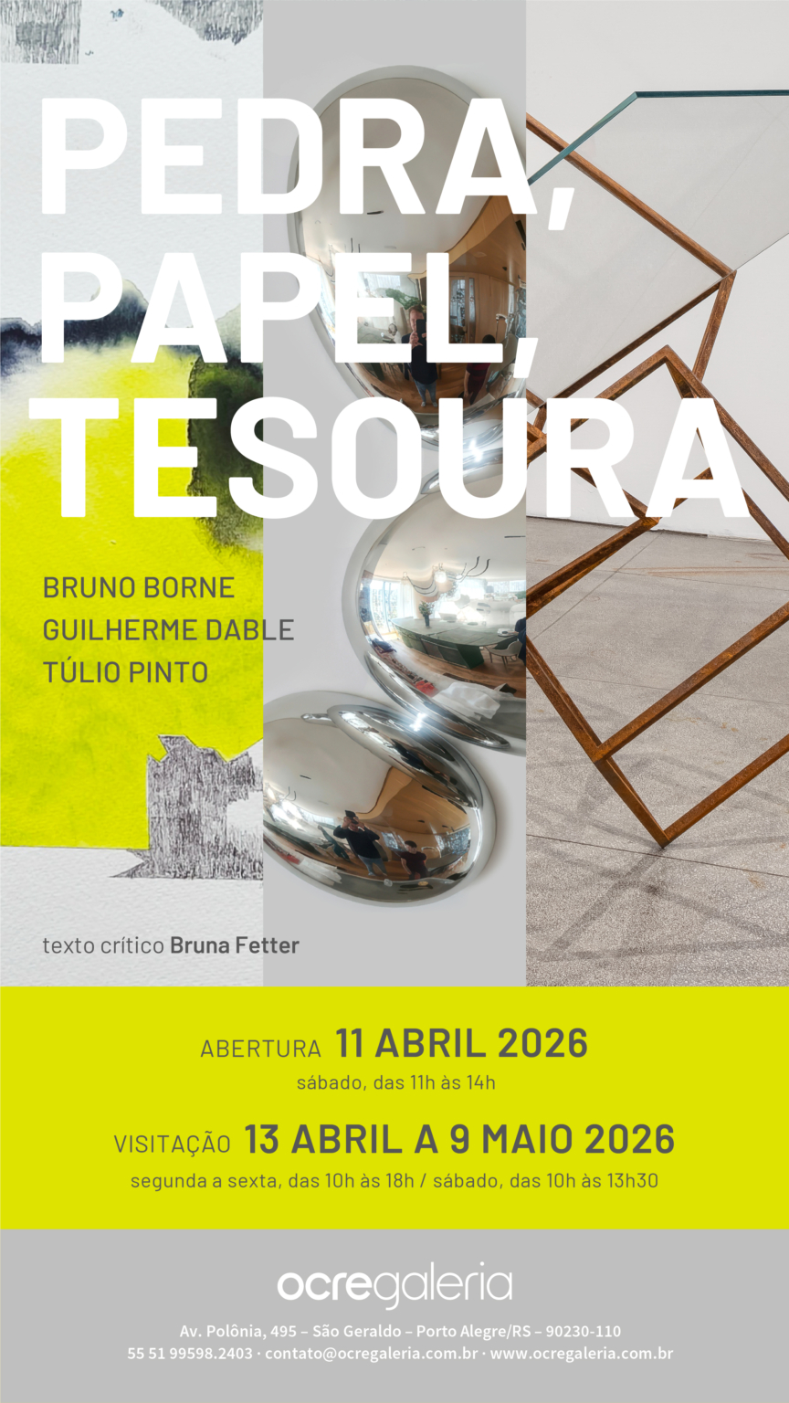 A exposição Pedra, papel, tesoura, que abre ao público no próximo dia 11 de abril, sábado, na Ocre Galeria, em Porto Alegre, reúne três artistas cujas trajetórias se cruzam há décadas, mas que raramente compartilharam o mesmo espaço expositivo. A coletiva propõe tornar visível uma conversa contínua, feita de afinidades, contrastes e deslocamentos, entre diferentes linguagens da arte contemporânea. Com trabalhos que transitam entre escultura, desenho, pintura, vídeo e imagem digital, a mostra articula a produção de Túlio Pinto, Guilherme Dable e Bruno Borne a partir de um princípio comum: a relação. Se, por um lado, cada artista opera em um campo específico – das estruturas materiais de Túlio às experimentações gráficas de Dable e às investigações imagéticas de Borne, por outro, há entre eles uma proximidade que não se limita à estética, mas se estabelece como pensamento compartilhado. “O que une esses artistas é uma amizade de longa data e uma troca constante. A exposição surge como a vontade de formalizar relações que já existem”, afirma Bruna Fetter, responsável pelo texto crítico. “Eu estou trabalhando no texto a partir do livro do Ítalo Calvino, Seis propostas para o próximo milênio. Esse livro fala de linguagem, questões formais, questões éticas e eu vejo isso atravessando a exposição”, observa a pesquisadora e professora do Instituto de Artes da UFRGS. O título da exposição, inspirado no jogo infantil, sugere um sistema de regras simples, mas aberto a variações. Nele, não há hierarquia fixa, mas um movimento contínuo de forças, onde cada elemento pode, em determinado momento, sobrepor o outro. Essa lógica atravessa também a expografia: obras distintas, que não buscam síntese, mas convivência. A exposição é a materialização de um diálogo em processo entre os três artistas que se desenvolve há 20 anos. “É uma oportunidade de tornar público algo que sempre aconteceu no privado: uma conversa sobre arte, sobre processo, sobre escolhas”, resume Túlio Pinto. Afinidade com diversidade de linguagens Na exposição Pedra, papel, tesoura, que permanecerá aberta à visitação pública até 9 de maio, a diversidade de linguagens não dilui o conjunto, ao contrário, é justamente no contraste que se estabelecem as relações. Túlio Pinto apresenta quatro esculturas, duas de chão, uma de parede e uma suspensa, construídas a partir de materiais como vidro, aço e pedra. Seu trabalho investiga as tensões e equilíbrios possíveis entre esses elementos, em composições que evidenciam estruturas e forças em relação. Já Guilherme Dable reúne desenhos e pinturas em pequeno formato, desenvolvidos como parte de uma prática contínua. Os trabalhos operam sob regras auto-impostas, como a limitação de intervenções, e se resolvem em gestos rápidos, aproximando o fazer artístico de uma lógica de jogo. ´”É quase um jogo; eu me imponho regras, como não voltar mais de três vezes ao desenho. Eles precisam se resolver rapidamente”, revela. Por sua vez, Bruno Borne apresenta três trabalhos inéditos, entre esculturas de parede, vídeo e imagem digital. Sua pesquisa, que parte de uma investigação da imagem, ganha prolongamentos no espaço, nesta exposição, explorando a transição entre o virtual e o material. “Agora, as imagens se desdobram em forma escultórica”, antecipa. Apesar das diferenças formais, os três artistas compartilham um campo de reflexão comum. “A influência não é direta nas obras, mas no pensamento”, como sintetiza Dable, evidenciando que é na troca, mais do que na forma, que a exposição encontra sua unidade. Sobre os artistas convidados Bruno Borne (Porto Alegre, RS, 1979) é artista e arquiteto, doutor em Poéticas Visuais pelo PPGAV/UFRGS. Trabalha com reflexões, espelhamentos, luz, som e computação gráfica realizando videoinstalações, esculturas e impressões digitais Desde 2010 vem realizando exposições em diversos museus, galerias e instituições culturais no Brasil. Participou da 13ª Bienal do Mercosul. Possui obras incorporadas aos acervos do MARGS, MAC-PR, MAC-RS e das prefeituras de Porto Alegre e Santo André. Tem obras adquiridas junto aos acervos privados do Banrisul, Grupo Zaffari e UFC. Guilherme Dable (Porto Alegre, RS, 1976) é Doutor em Poéticas Visuais pelo IA/UFRGS. Foi um dos fundadores e cogestor do Atelier Subterrânea, espaço independente baseado em Porto Alegre ativo entre 2006 e 2015. Sua pesquisa abarca principalmente as linguagens do desenho e da pintura, expandindo-se para investigações que flertam com a ocupação do espaço, não se atendo somente aos suportes tradicionais das linguagens. Seu trabalho pensa relações entre arquitetura, paisagem e as características diagramáticas da linguagem do desenho, utilizando-se eventualmente de métodos não convencionais para produzir desenhos. Foi artista residente em instituições nos Estados Unidos e na Finlândia. Túlio Pinto (Brasília, DF, 1974) é formado em artes visuais com ênfase em escultura pela Universidade Federal do Rio Grande do Sul – UFRGS (2009). desenvolve trabalhos entre a escultura e a instalação, explorando a espacialidade e as propriedades físicas e visuais da matéria. Os conceitos de equilíbrio e de harmonia permeiam de maneira singular a elaboração de cada peça, em que o jogo entre pesos, tamanhos e densidades formula a coexistência de opostos como rigidez e fragilidade, equilíbrio e queda. Utilizando materiais como concreto, chapas de ferro e vidros, sua produção investiga o conceito de efemeridade e transformação que circundam a relação entre corpos e o espaço. Realizou exposições individuais em instituições como o Museu Oscar Niemeyer (Curitiba) e a Fondamenta Sant’Apollonia (Veneza), além de participar de importantes mostras coletivas, como a 13ª Bienal do Mercosul. Recebeu diversos prêmios ao longo de sua traje